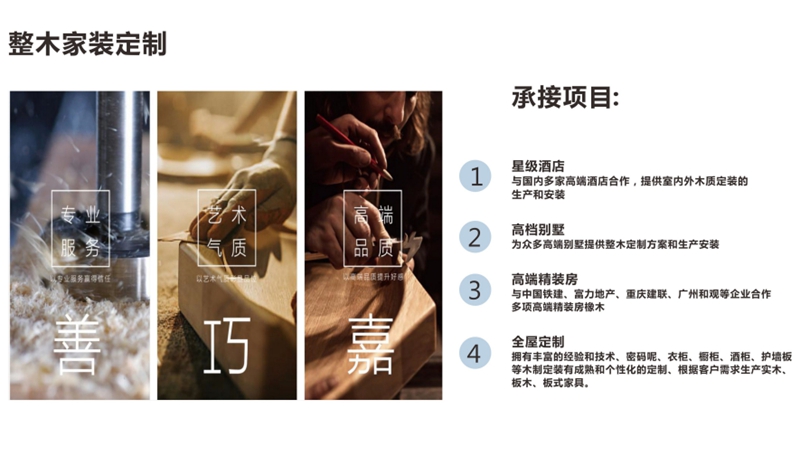 多年來得到中鐵地產(chǎn)、富力地產(chǎn)、實(shí)地地產(chǎn)、碧桂園地產(chǎn)、華為集團(tuán)、希爾頓酒店等大型企業(yè)的認(rèn)可。公司一直默默無聞地致力做品牌身后的品牌,在市場上競爭中,具有競爭力,是木作和定制從業(yè)者創(chuàng)業(yè)致富的理性選擇。